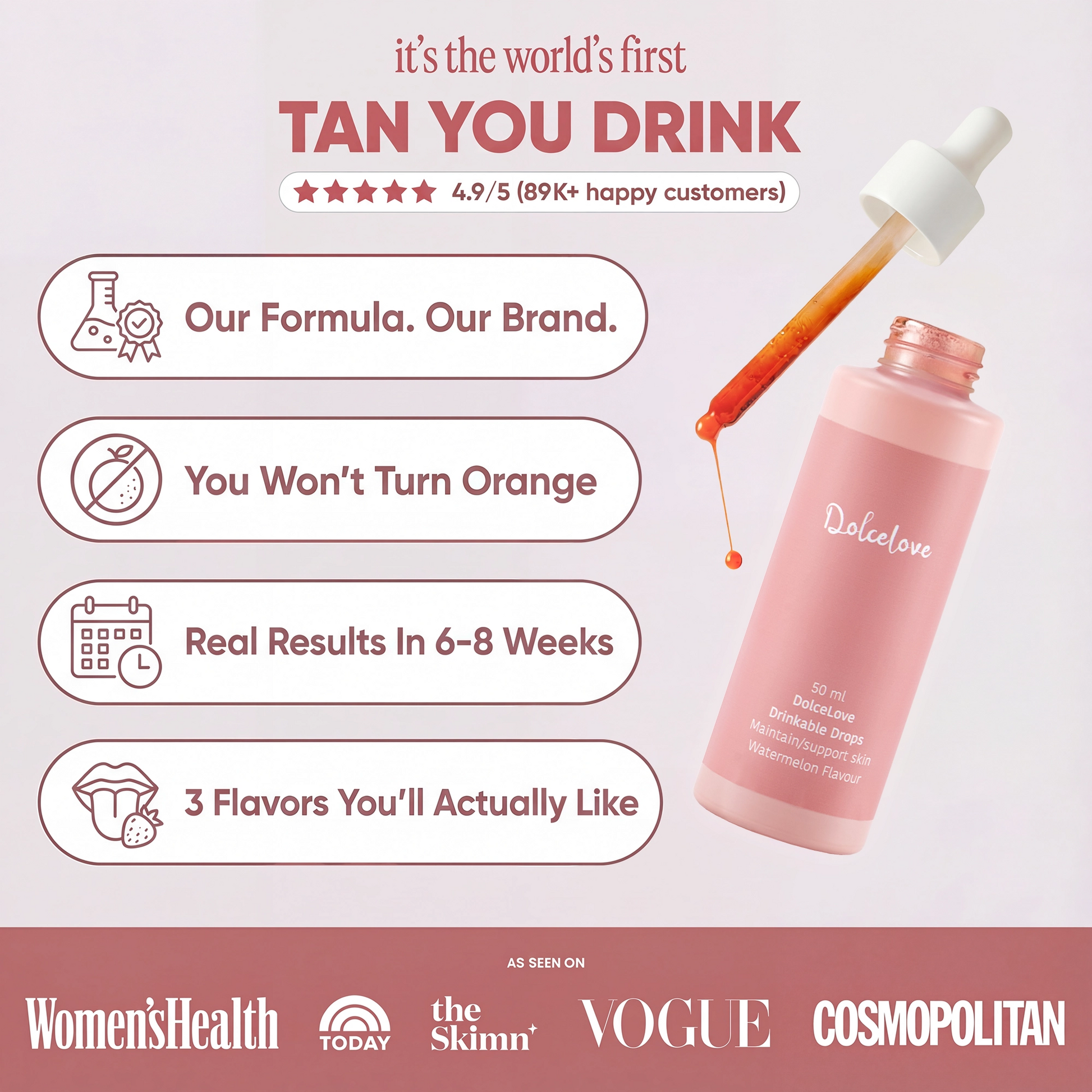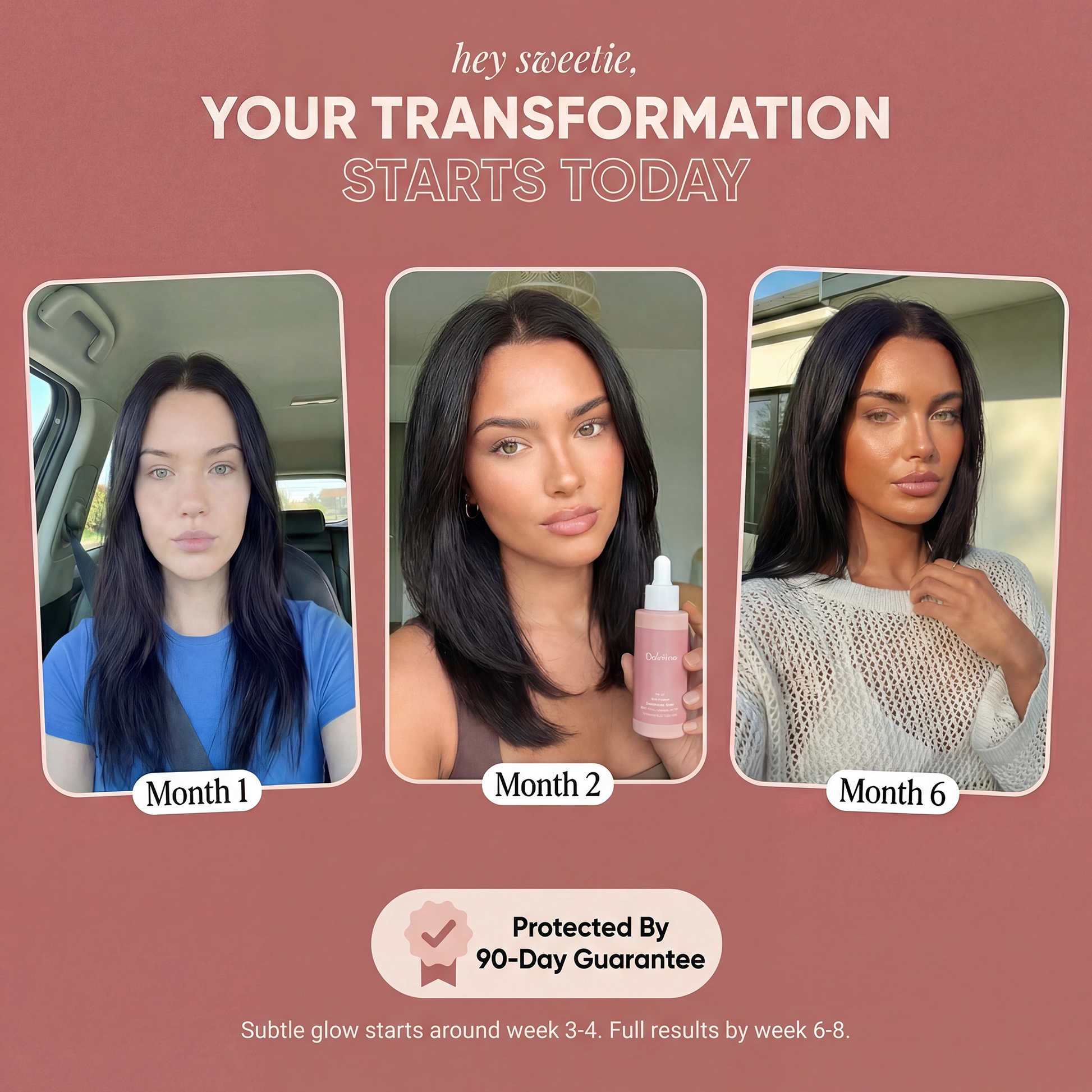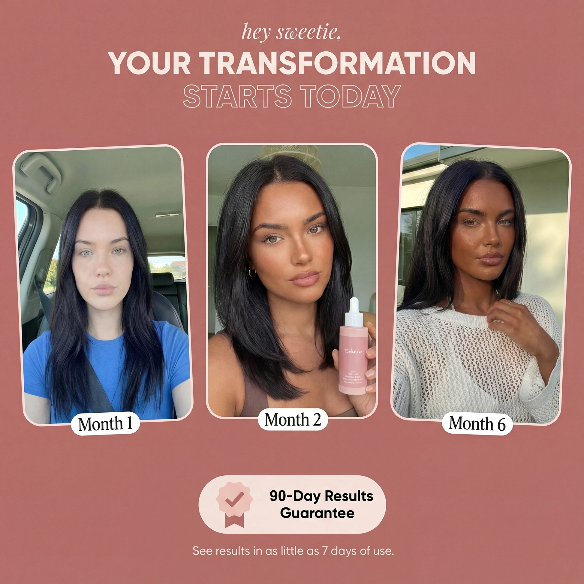 With DolceLove™, you’ll enjoy a natural tan, glowing skin, and real confidence — all from a few drops a day.